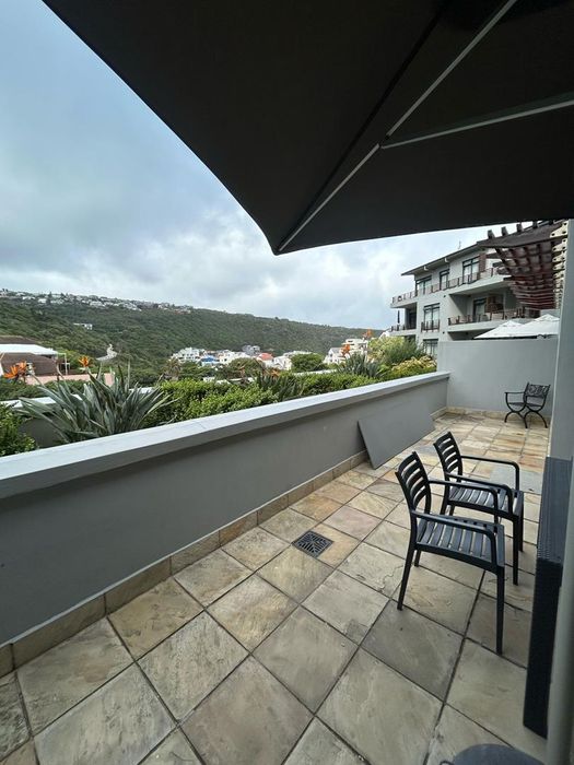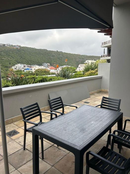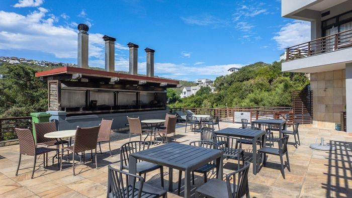Coastal living in Herolds Bay with private beach access — open-plan apartment opening to a large balcony overlooking greenbelt, communal pool and braai, main en-suite; 2 beds, 2 baths, parking.