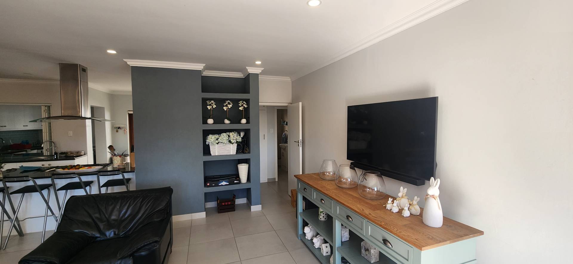 The open plan entertainment living area has an indoor braai and stack doors leading to a sizeable deck which creates an inviting transition between indoors and out.