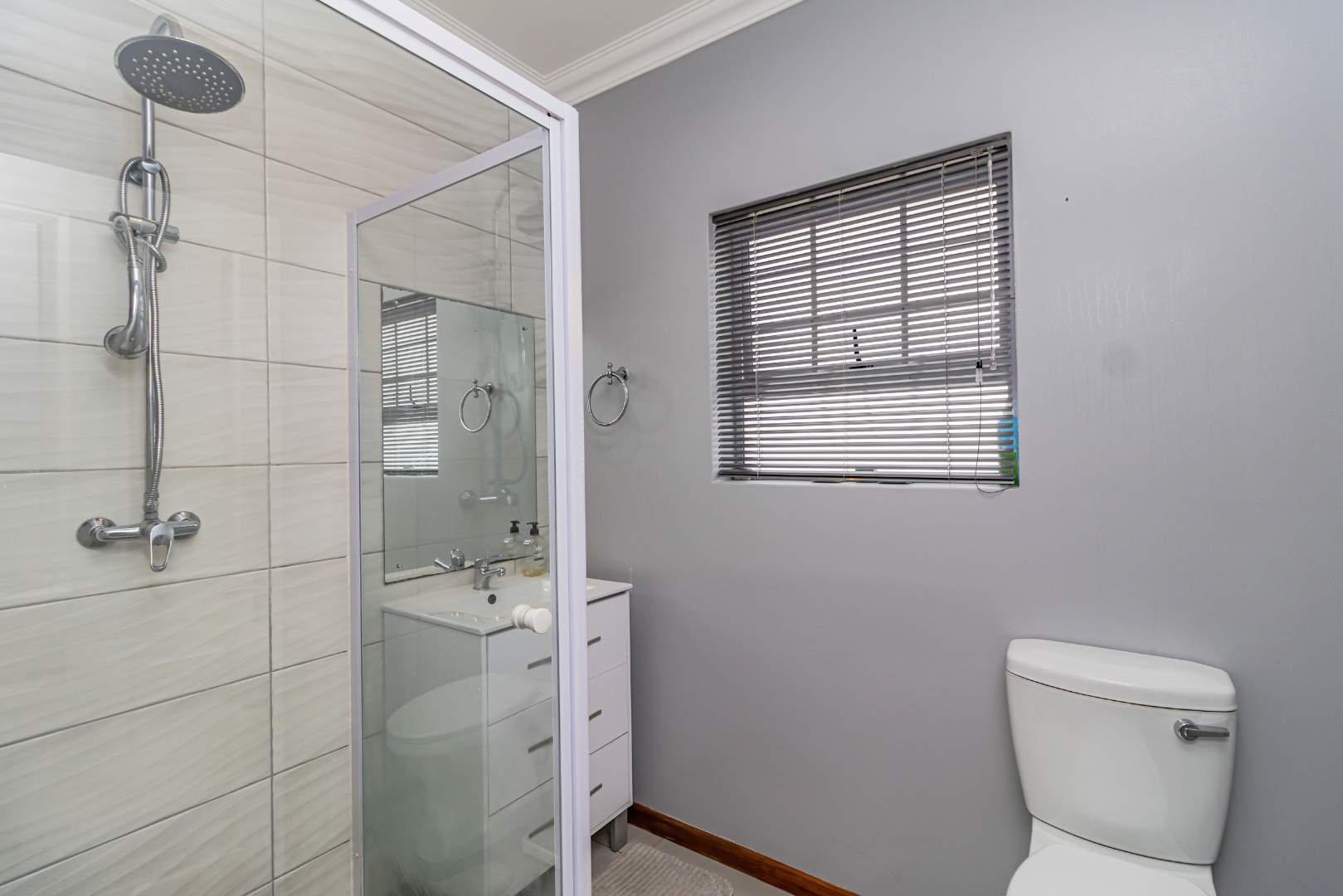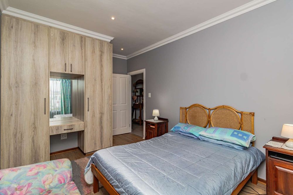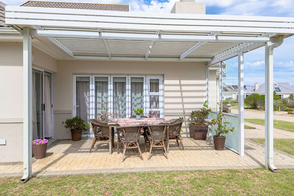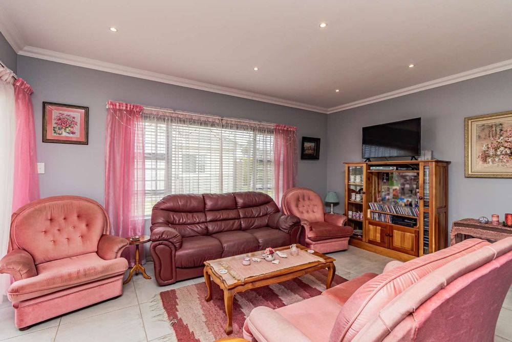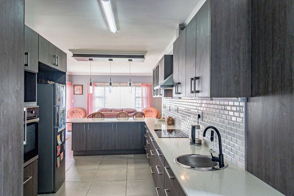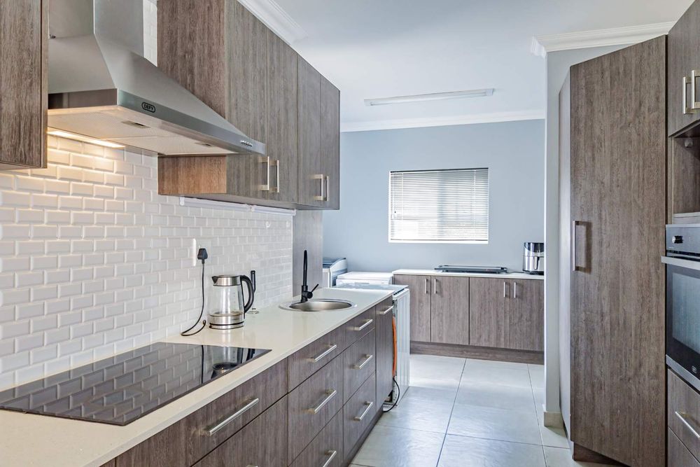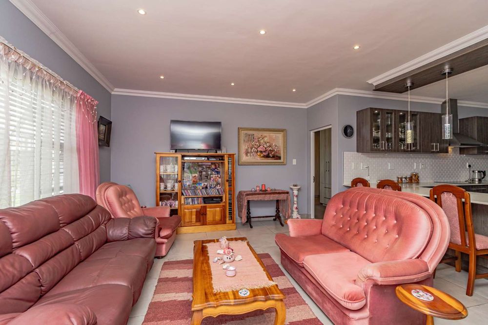 The open-plan lounge and dining area seamlessly connect to a braai room, creating a harmonious space for relaxation and entertainment.