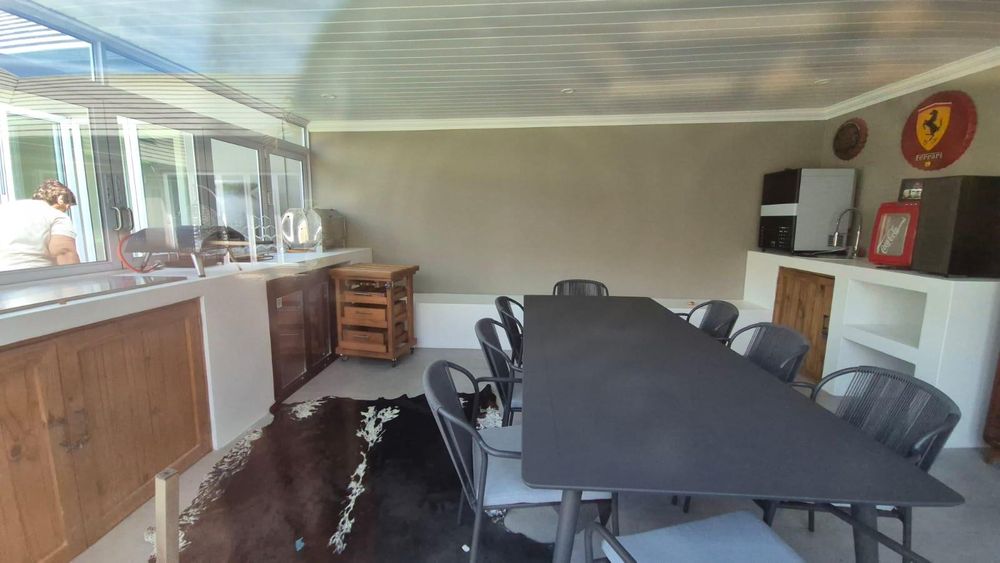 The property includes a stunning modern kitchen with a walk-in fridge/freezer and a separate scullery. There are American shutters throughout the house, two double garages with additional parking, and 12 solar panels with an inverter and battery for energy efficiency. Additionally, there is a bachelor flat for staff with a kitchenette and bathroom.