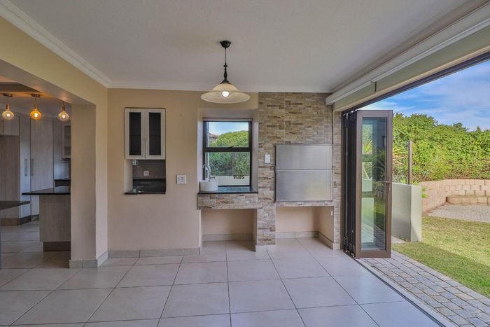 Relaxed entertaining and family living in a sought-after area close to beaches and main roads, featuring a wooden bridge with fountain, balcony braai and three bedrooms, three baths, double garage.