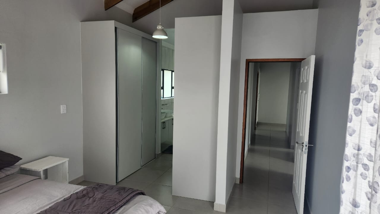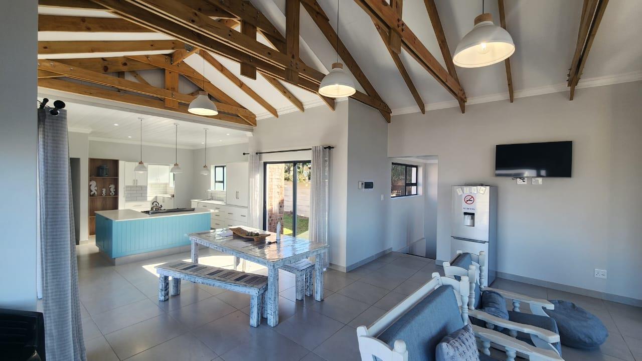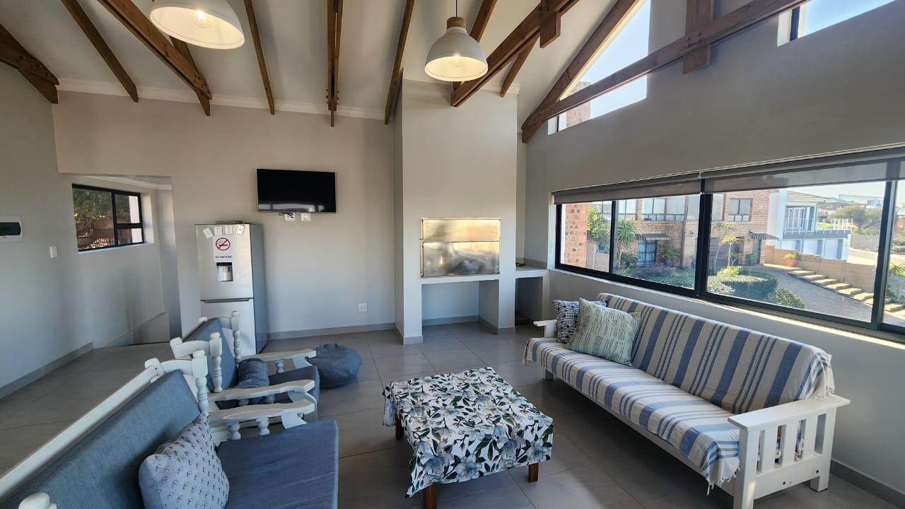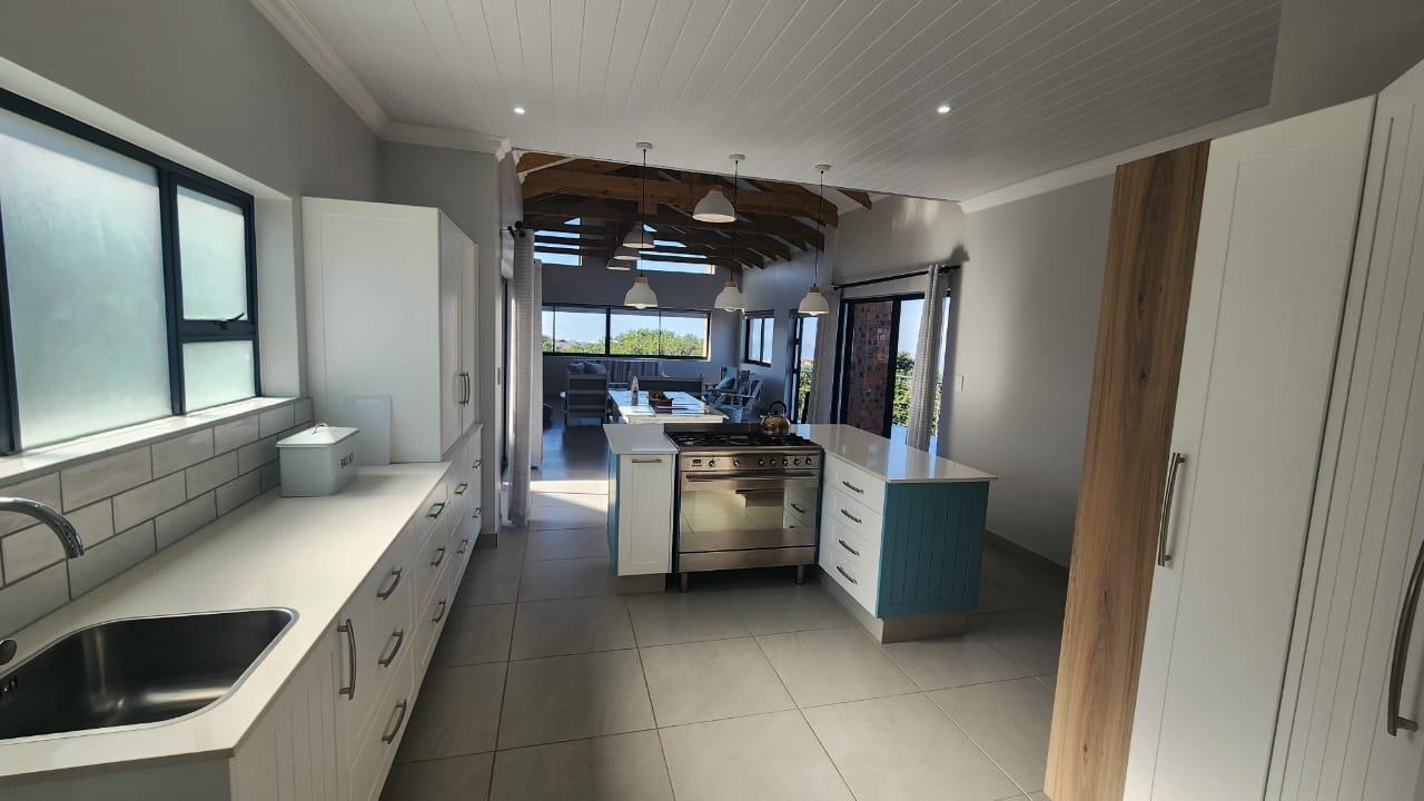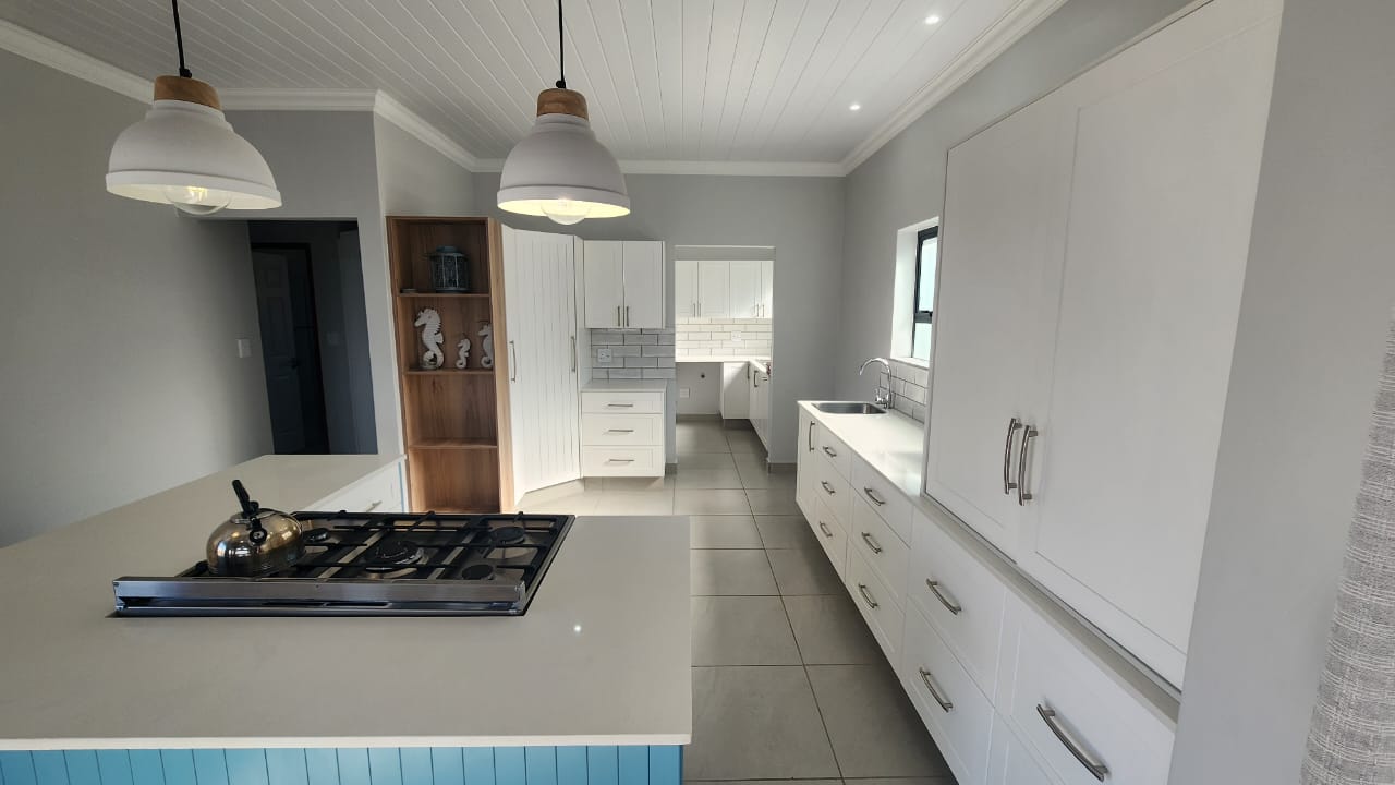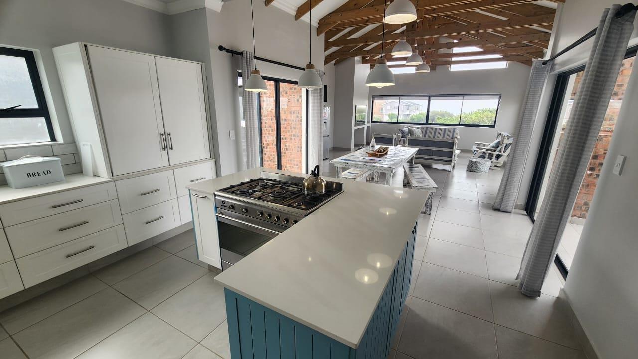 The spacious entertainment size living area has a built-in braai, open plan kitchen with lots of cupboards and convenient workspace, gas hob and Caesarstone counter tops.