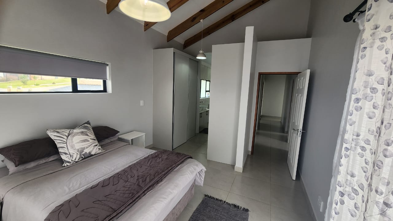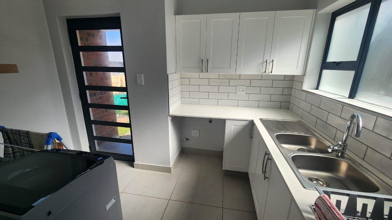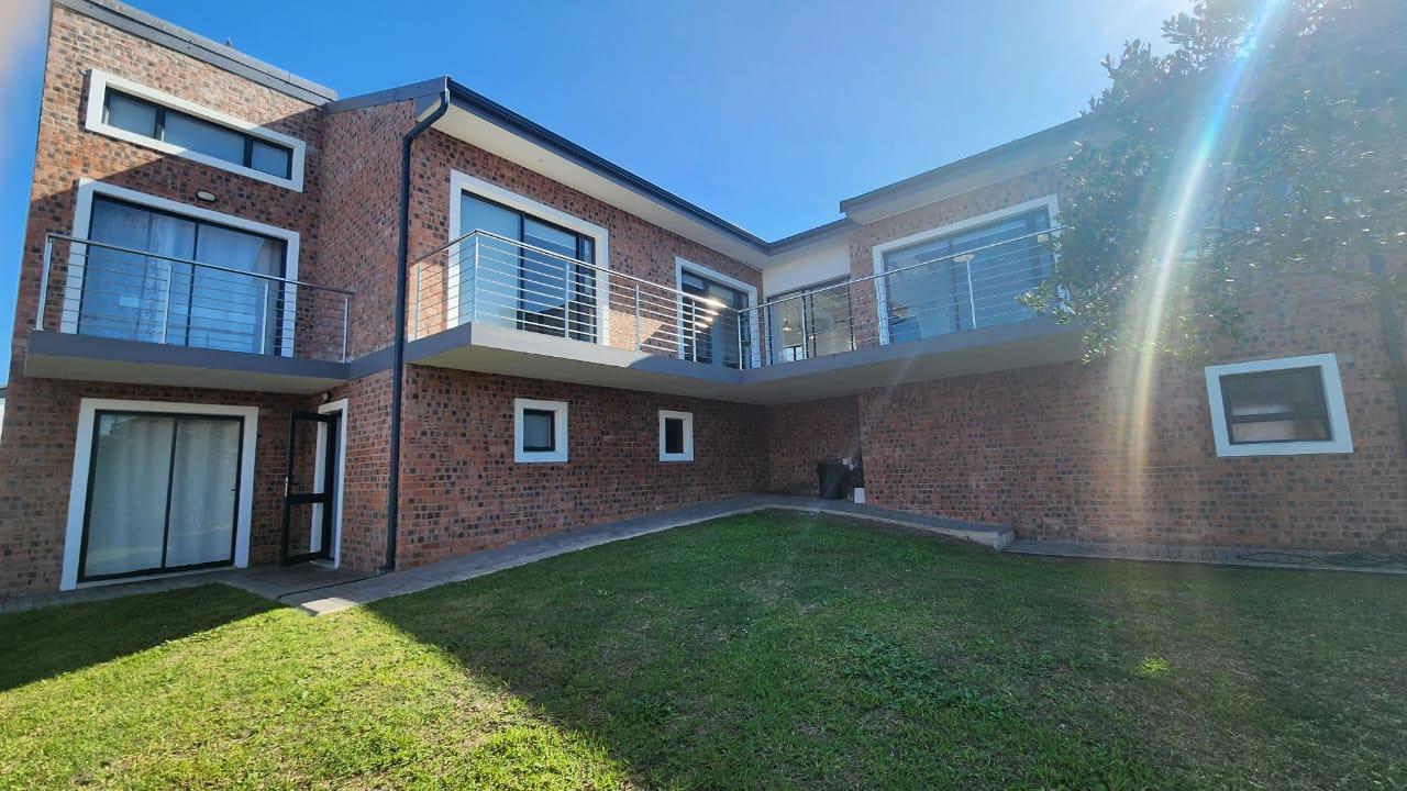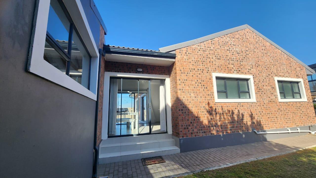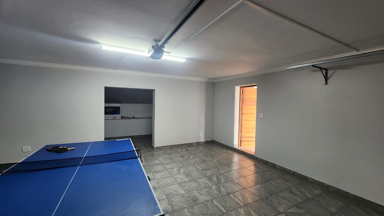 The spacious entertainment size living area has a built-in braai, open plan kitchen with lots of cupboards and convenient workspace, gas hob and Caesarstone counter tops.