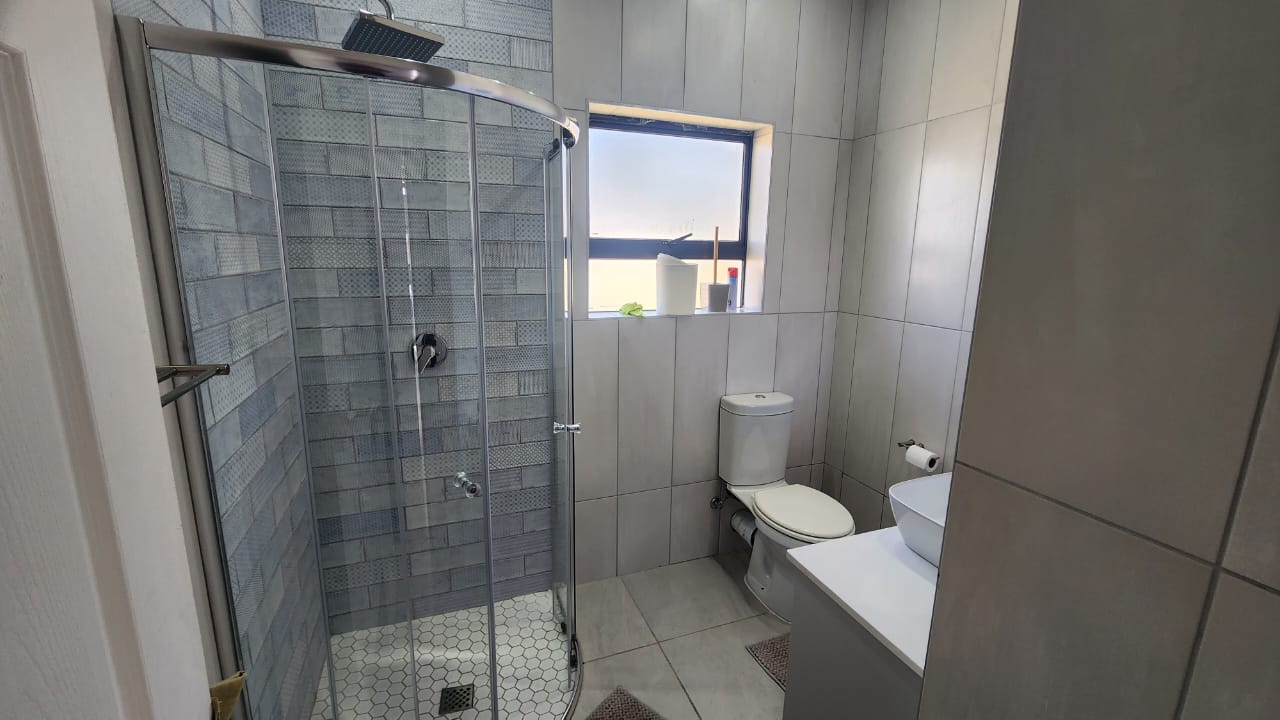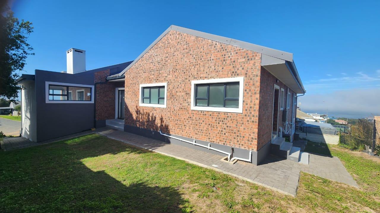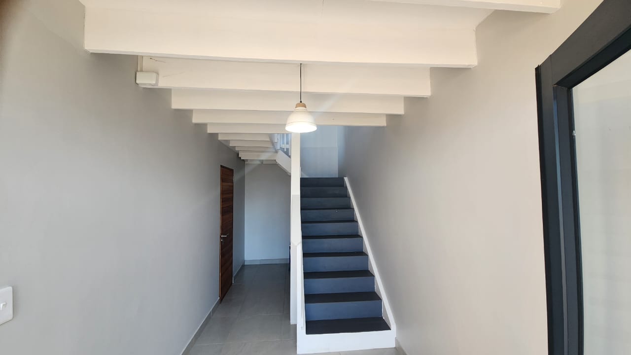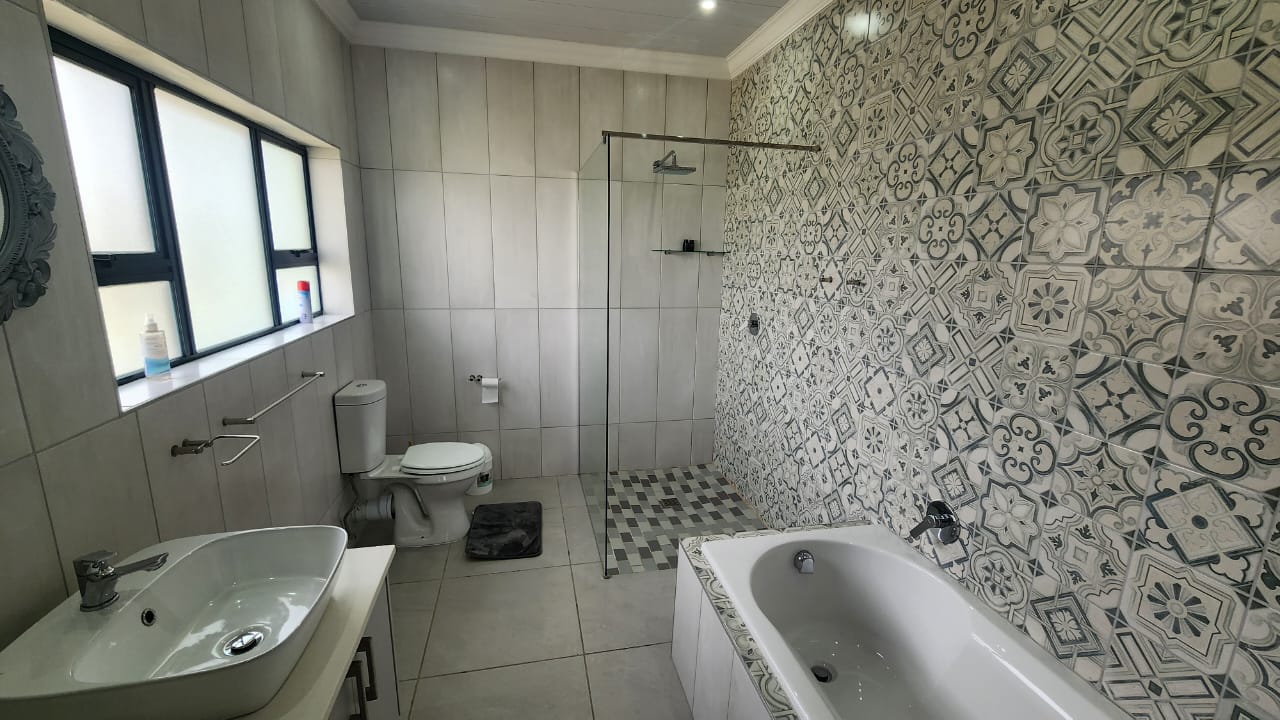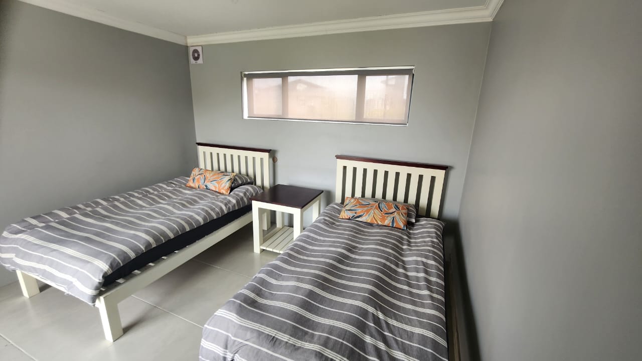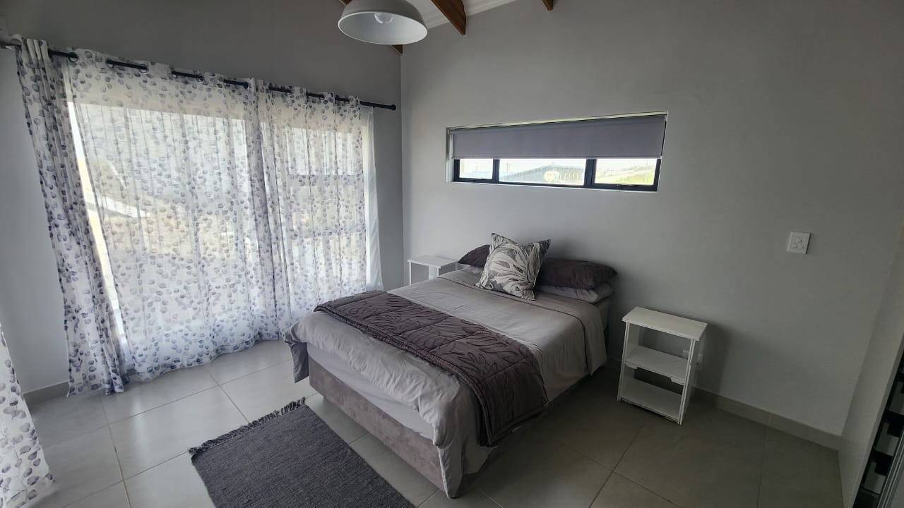 The spacious entertainment size living area has a built-in braai, open plan kitchen with lots of cupboards and convenient workspace, gas hob and Caesarstone counter tops.