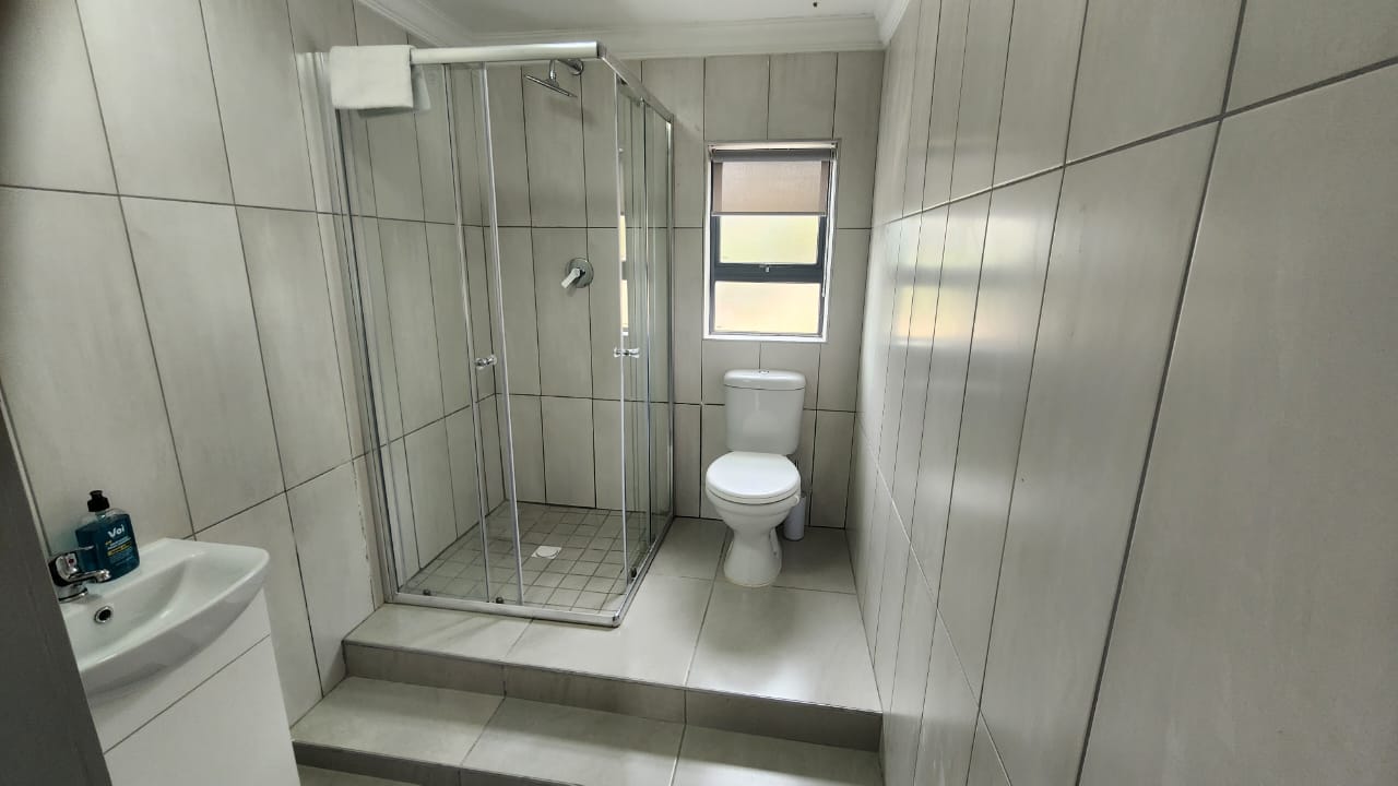The main bedroom has lots of cupboards and a full gleaming tiled bathroom.