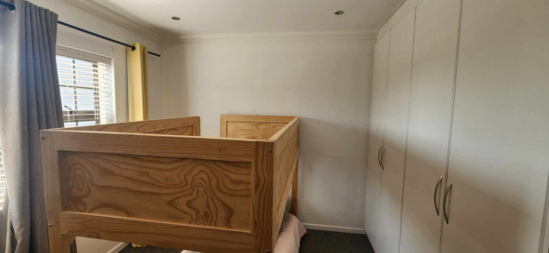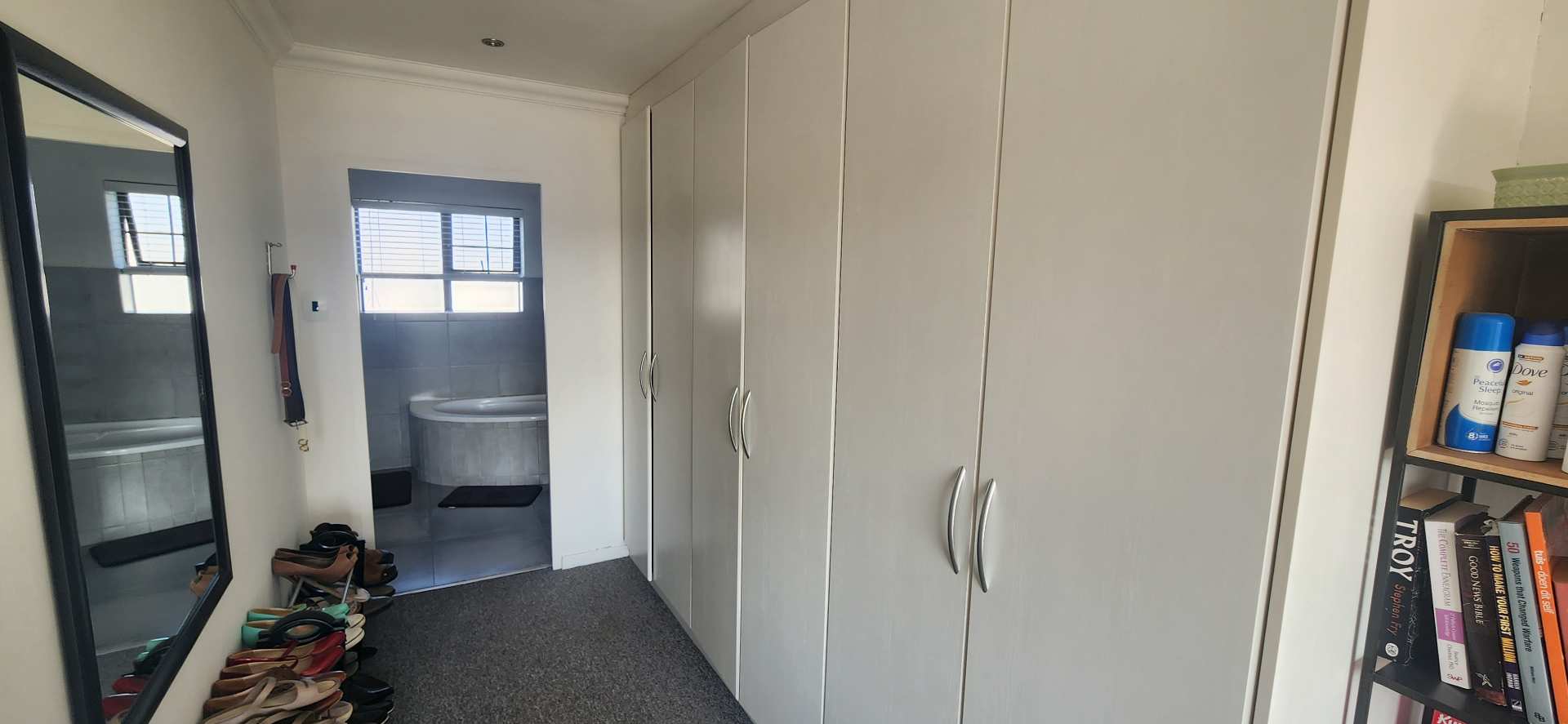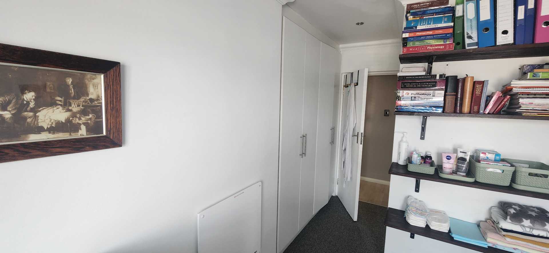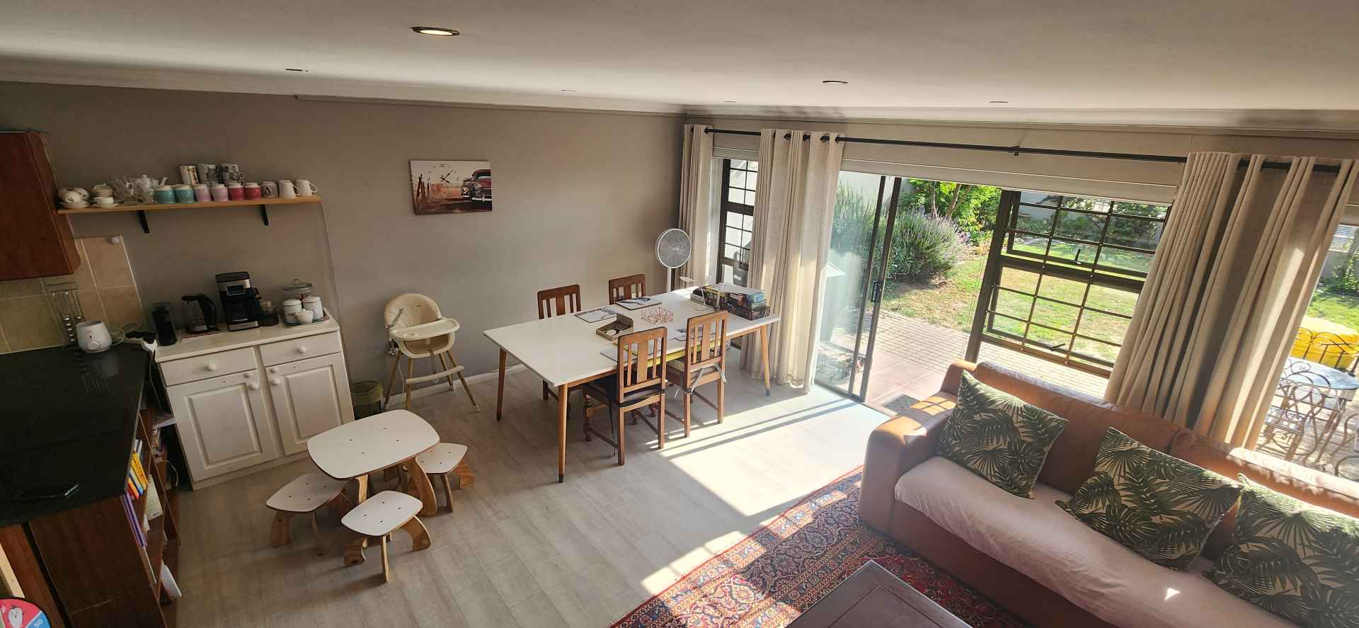 The living and dining area on the ground level is spacious with an aluminium sliding door with access to a lush garden area and braai area to relax.