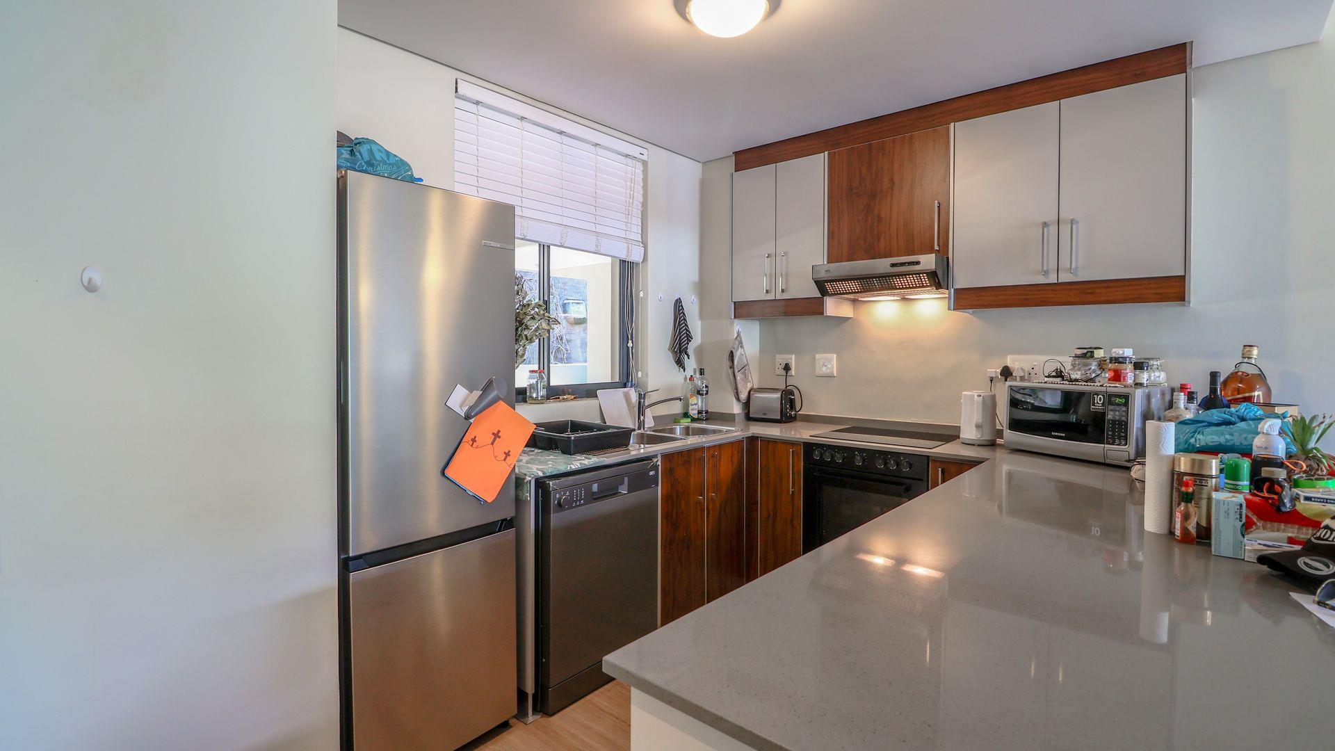 The apartment features an open-plan kitchen and lounge area, which seamlessly extends onto a large balcony. This outdoor space provides stunning views of the surrounding greenbelt, offering a tranquil retreat for relaxation or entertaining guests.