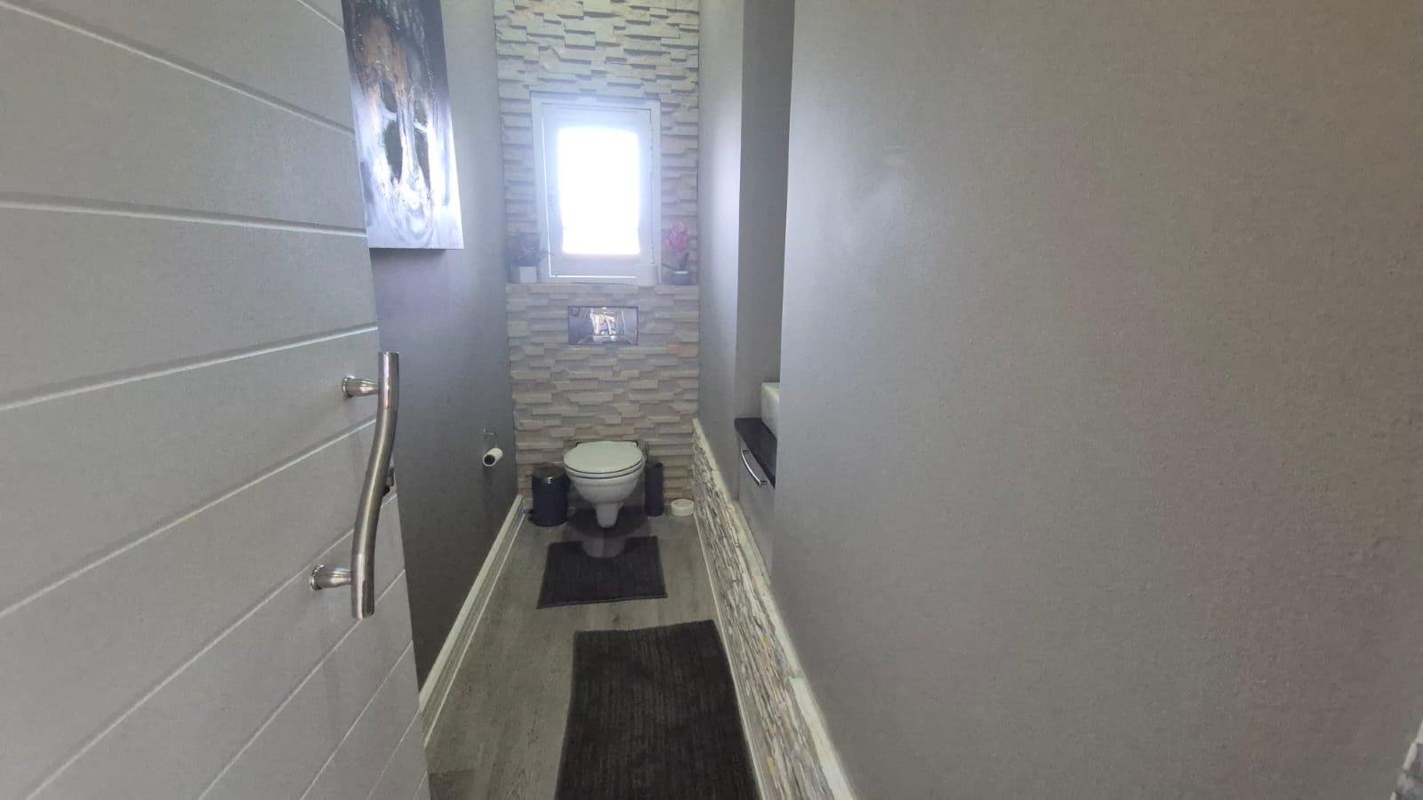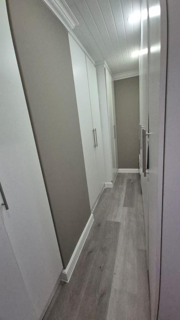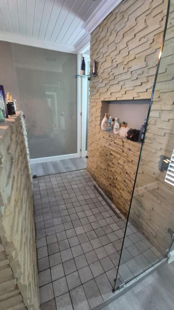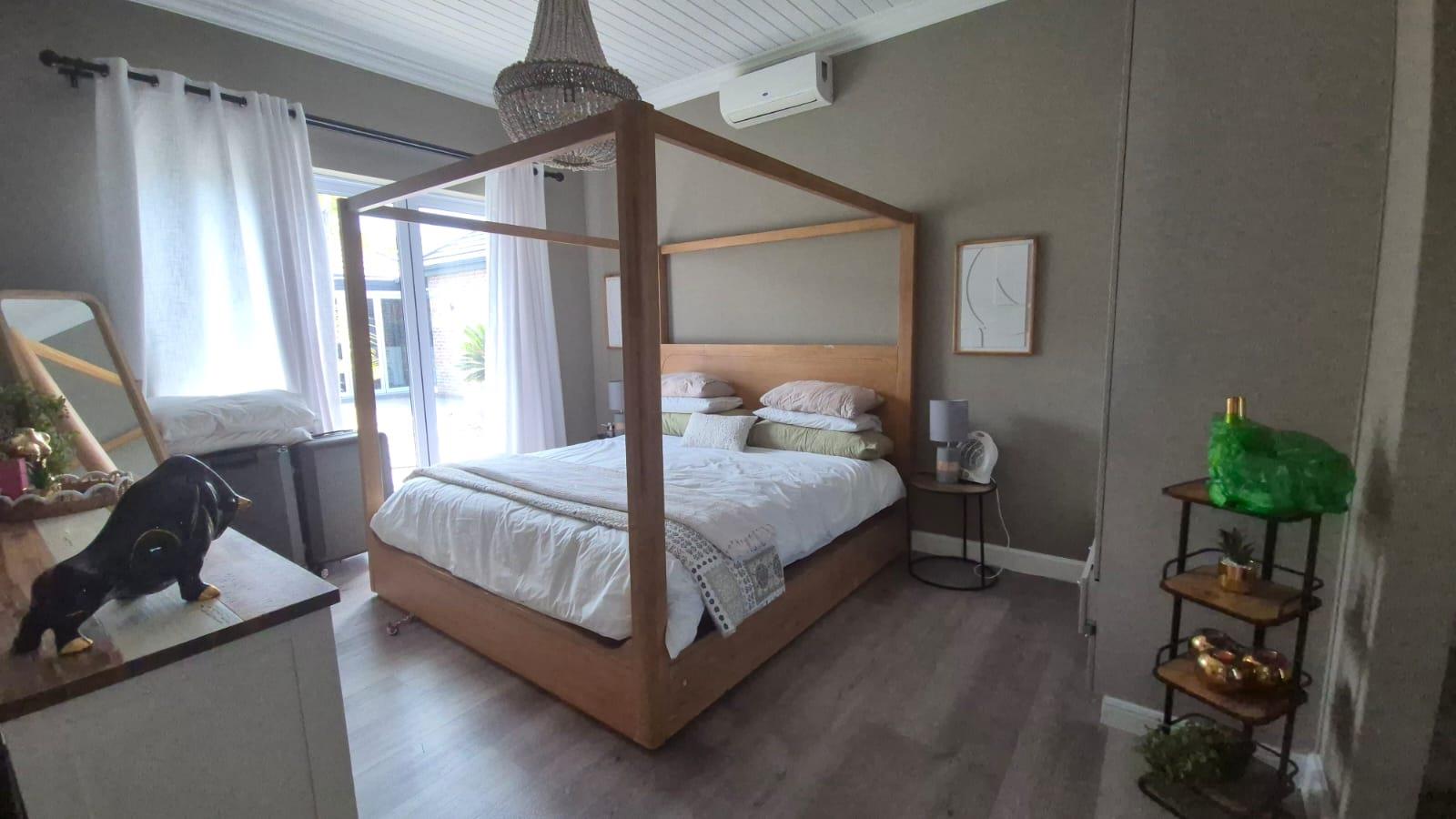 The property includes a stunning modern kitchen with a walk-in fridge/freezer and a separate scullery. There are American shutters throughout the house, two double garages with additional parking, and 12 solar panels with an inverter and battery for energy efficiency. Additionally, there is a bachelor flat for staff with a kitchenette and bathroom.