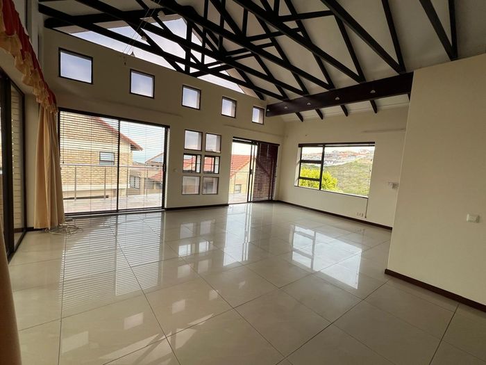 Coastal living in Seemeeupark, Mossel Bay — effortless entertaining on a covered patio with built-in braai and distant sea views. Three bedrooms, two bathrooms, double garage.