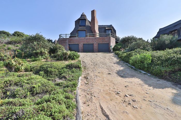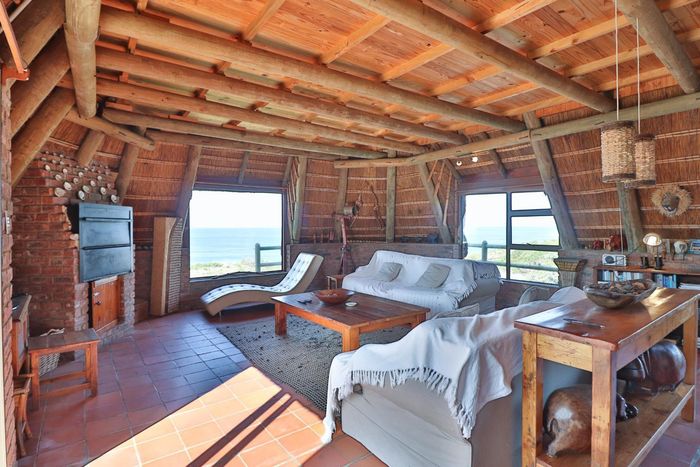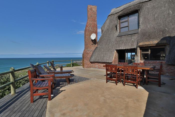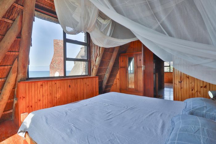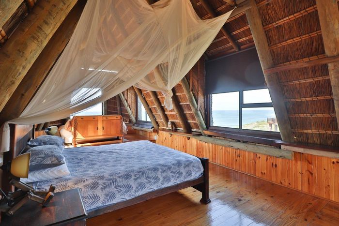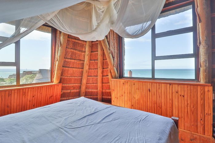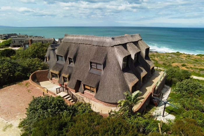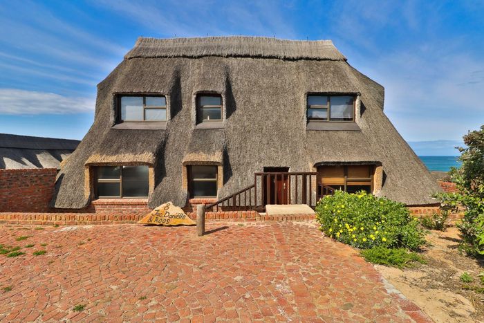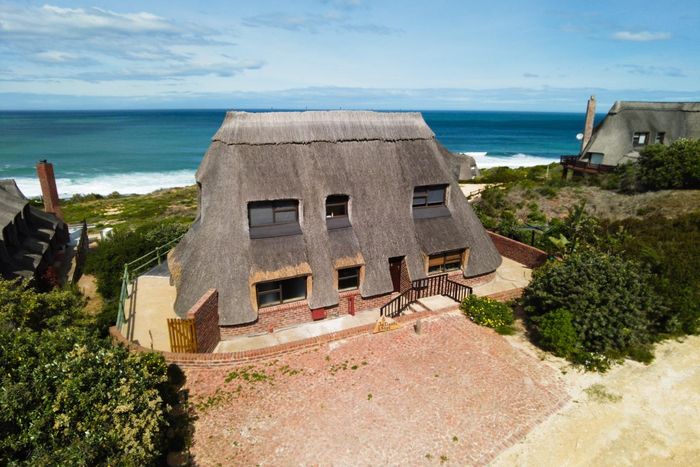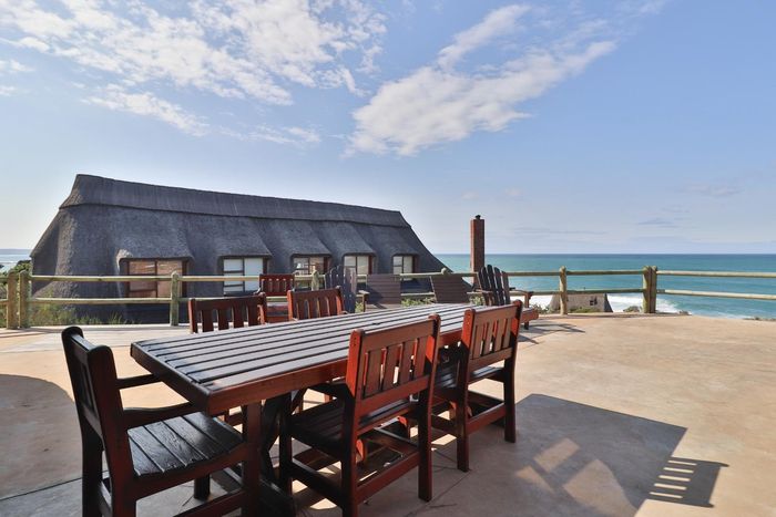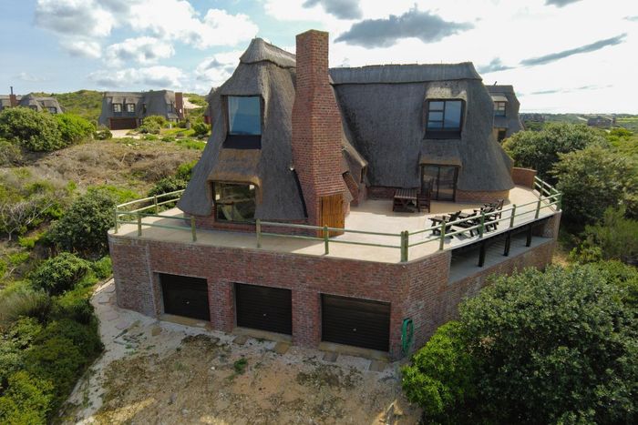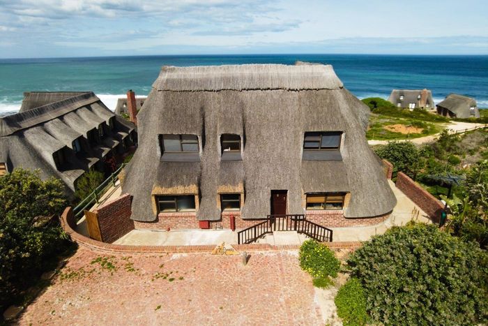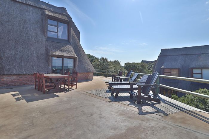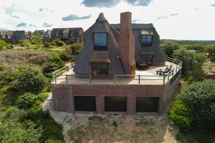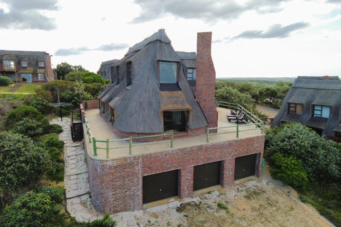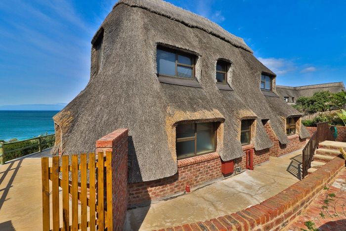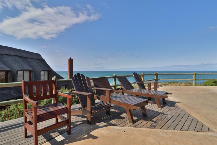 Beachside reserve living in Bosbokduin Estate with direct beach access and historic Visvywers; thatched home offers expansive ocean-view balconies, a country-style kitchen, five bedrooms, 3.5 baths, double garage.
