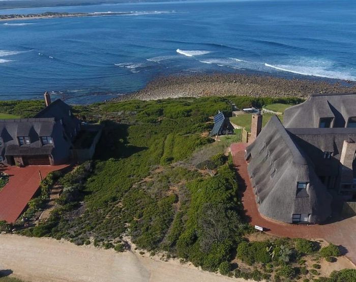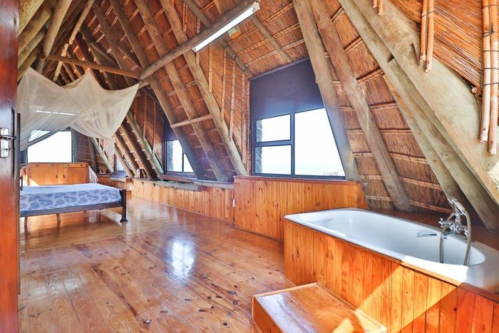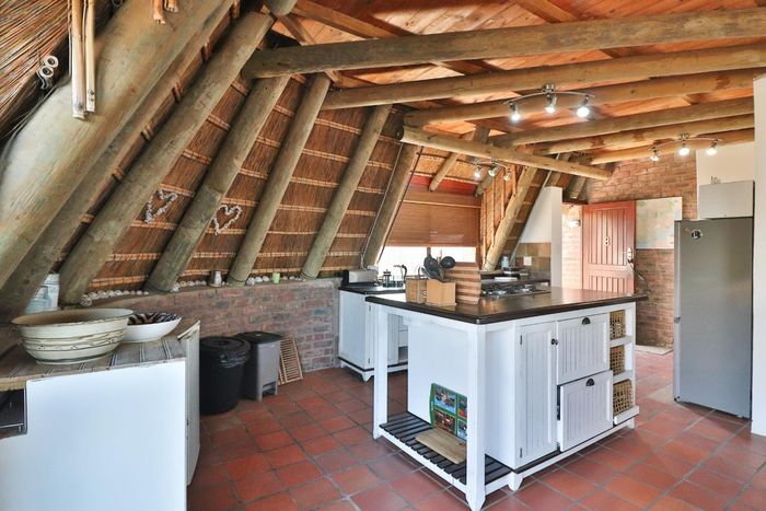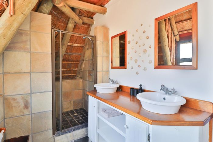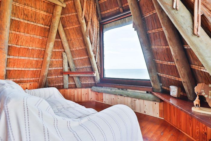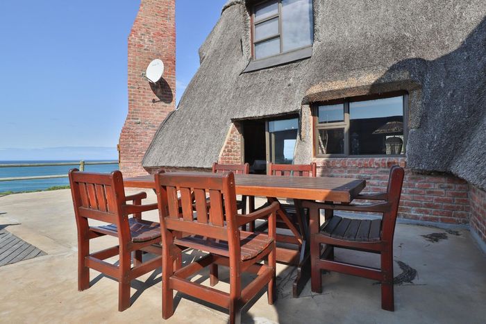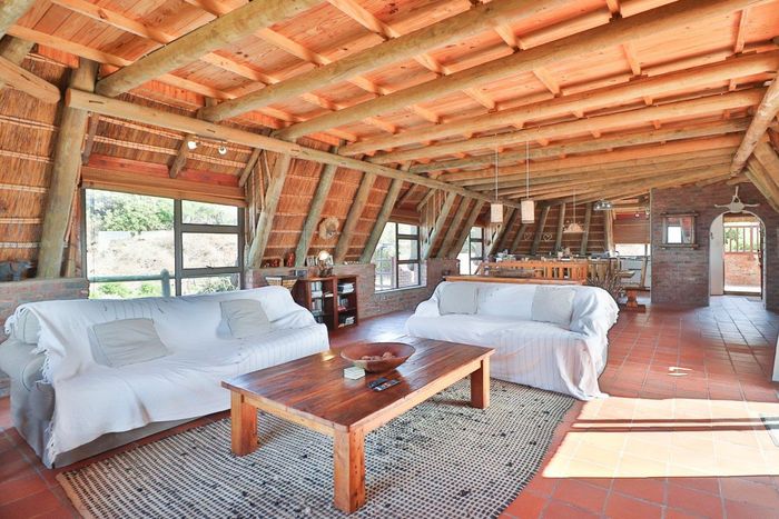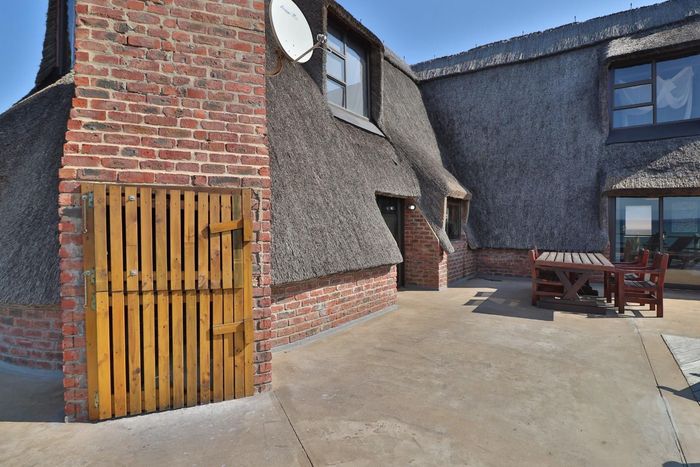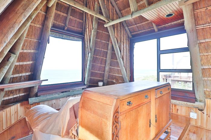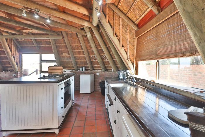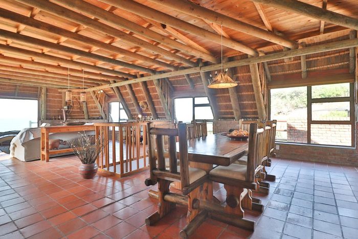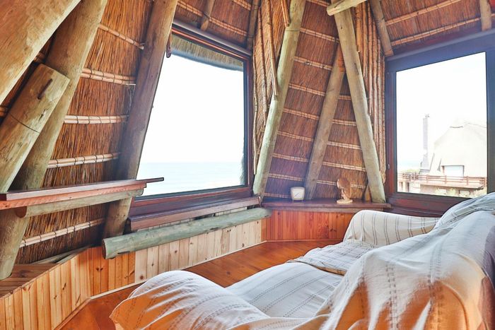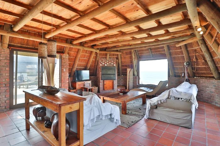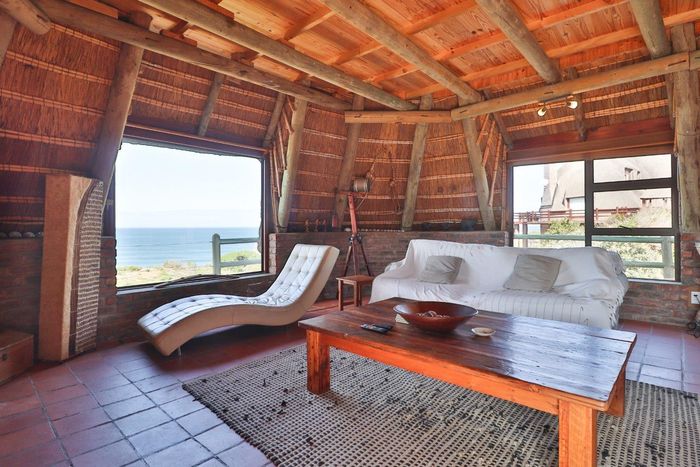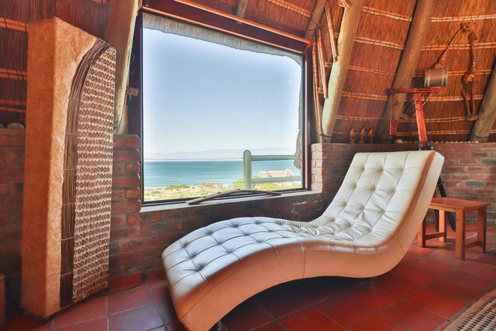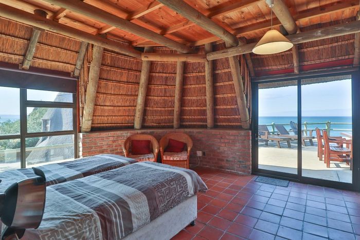 Beachside reserve living in Bosbokduin Estate with direct beach access and historic Visvywers; thatched home offers expansive ocean-view balconies, a country-style kitchen, five bedrooms, 3.5 baths, double garage.
