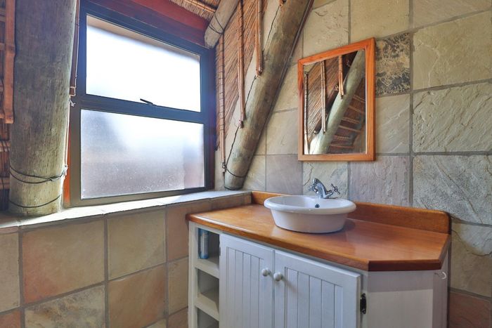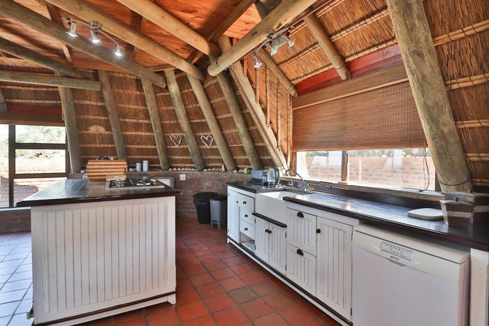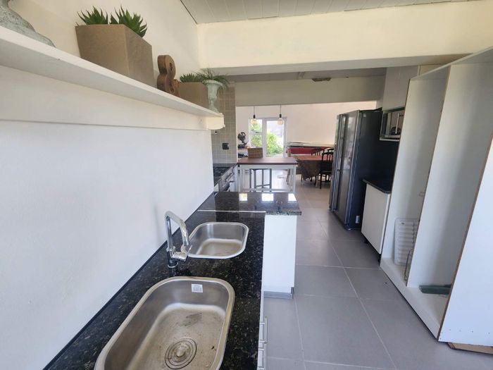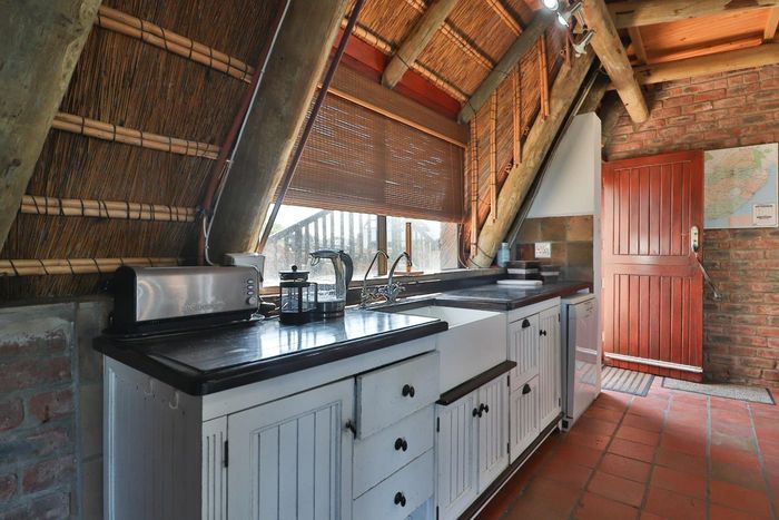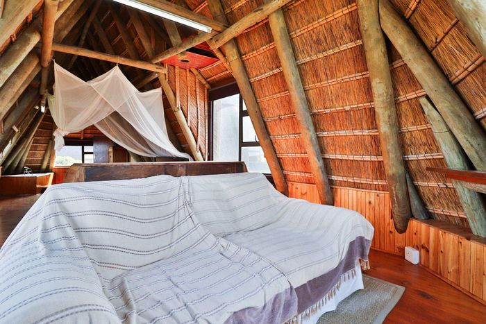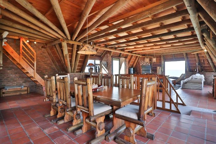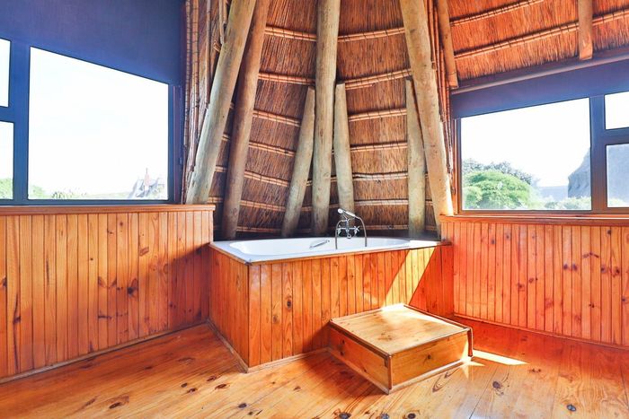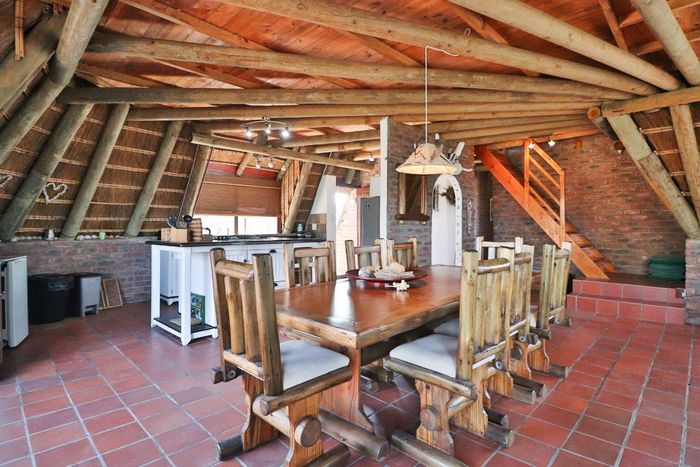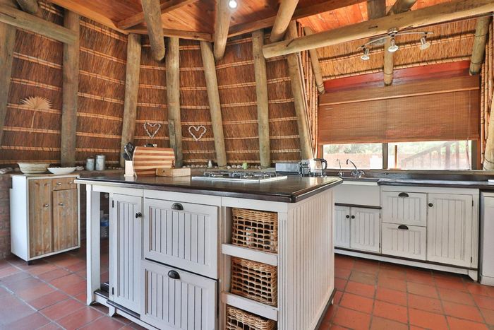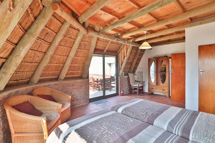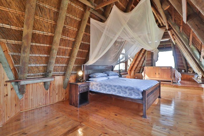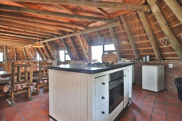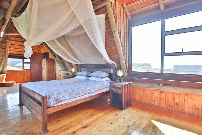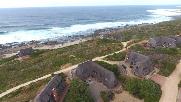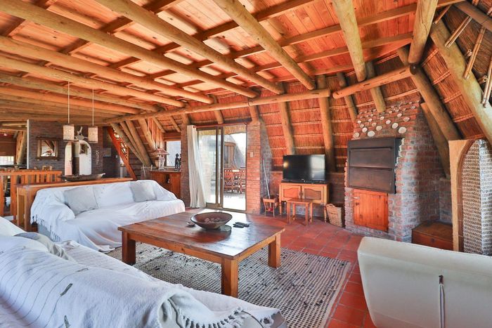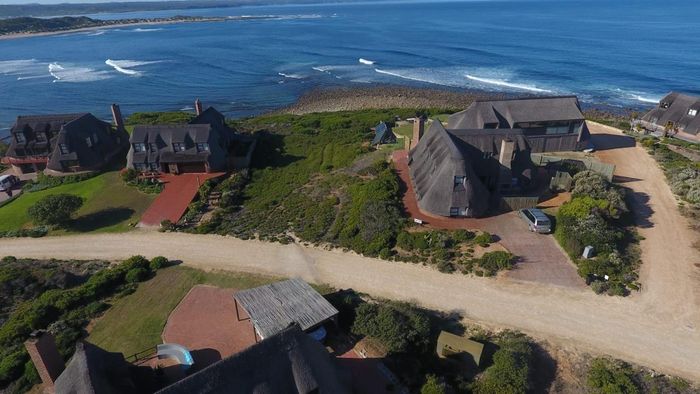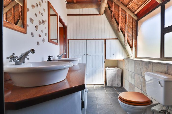 Beachside reserve living in Bosbokduin Estate with direct beach access and historic Visvywers; thatched home offers expansive ocean-view balconies, a country-style kitchen, five bedrooms, 3.5 baths, double garage.